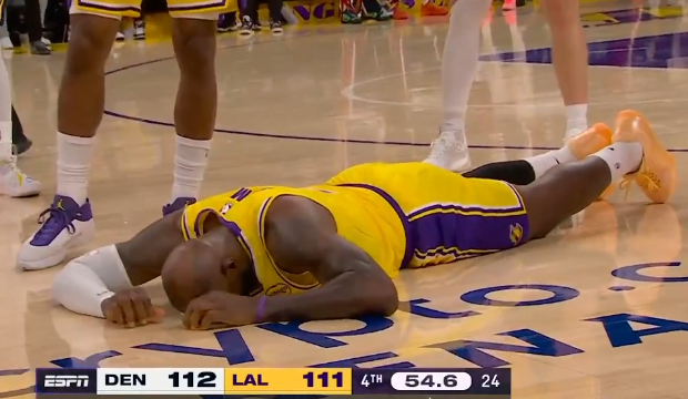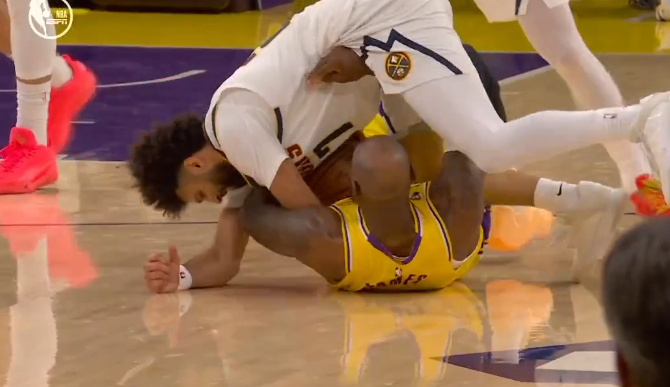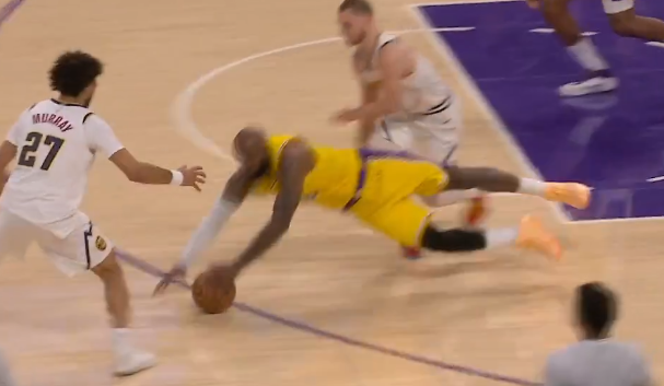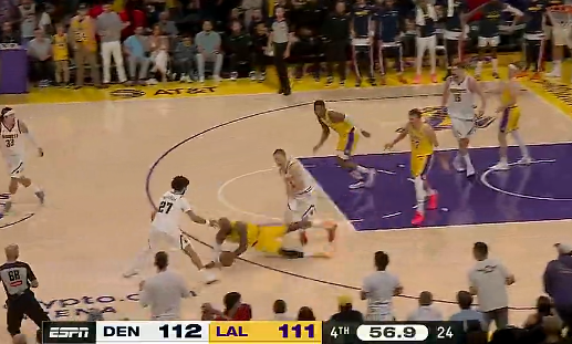 第四节比赛中,詹姆斯飞身鱼跃式救球,斯马特关键抢断上篮反超掘金1分。