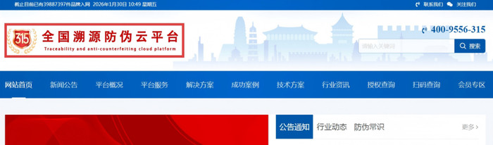 1月17日,有网民通过中央网信办违法和不良信息举报中心(下称举报中心)官网举报,反映名为“全国质量监督防伪系统”“中国产品监督315防伪查询系统”“315产品防伪查询中心”“全国产品质量12315防伪查询系统”等4家网站,使用“315”或“12315”数字注册域名,网站内容展示“国家某某平台”“全国某某平台”“315”等名称标识,并在搜索引擎上进行推广,通过定制所谓的“国家级溯源防伪标签”牟利,存在误导消费者的行为。