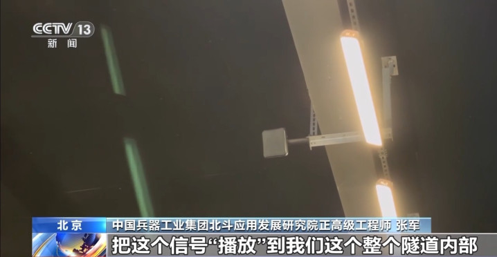 中国兵器工业集团北斗应用发展研究院正高级工程师张军:我们隧道顶上的天线呢,把这个信号“播放”到我们整个隧道内部,使我们整个隧道内部充满了北斗信号。